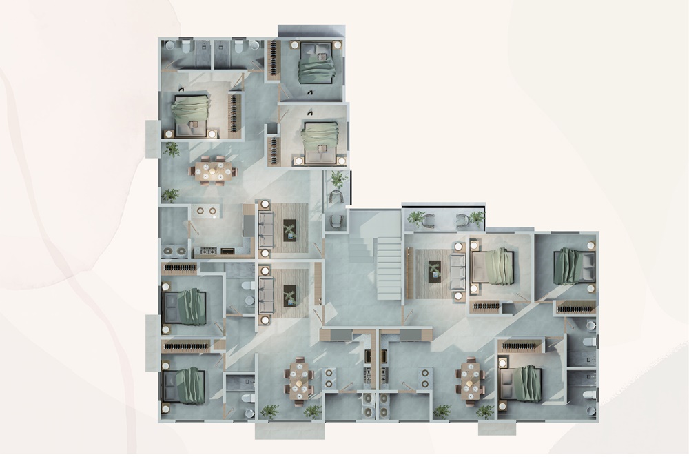 Los modelos de apartamentos varían en tamaño y distribución, pero todos cuentan con espacios amplios y bien iluminados para tu disfrute. Primeros pisos con patio y cuartos pisos con terraza privada.